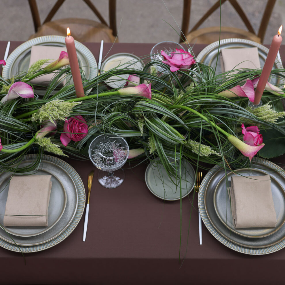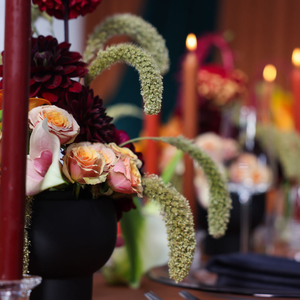 Warme herfstglamour: roestoranje velours tafelkleed, zwarte vaasjes met dahlia’s, (spray)rozen en oranje/roomwitte calla’s; hangende amarant voor beweging. Roestkleurige…