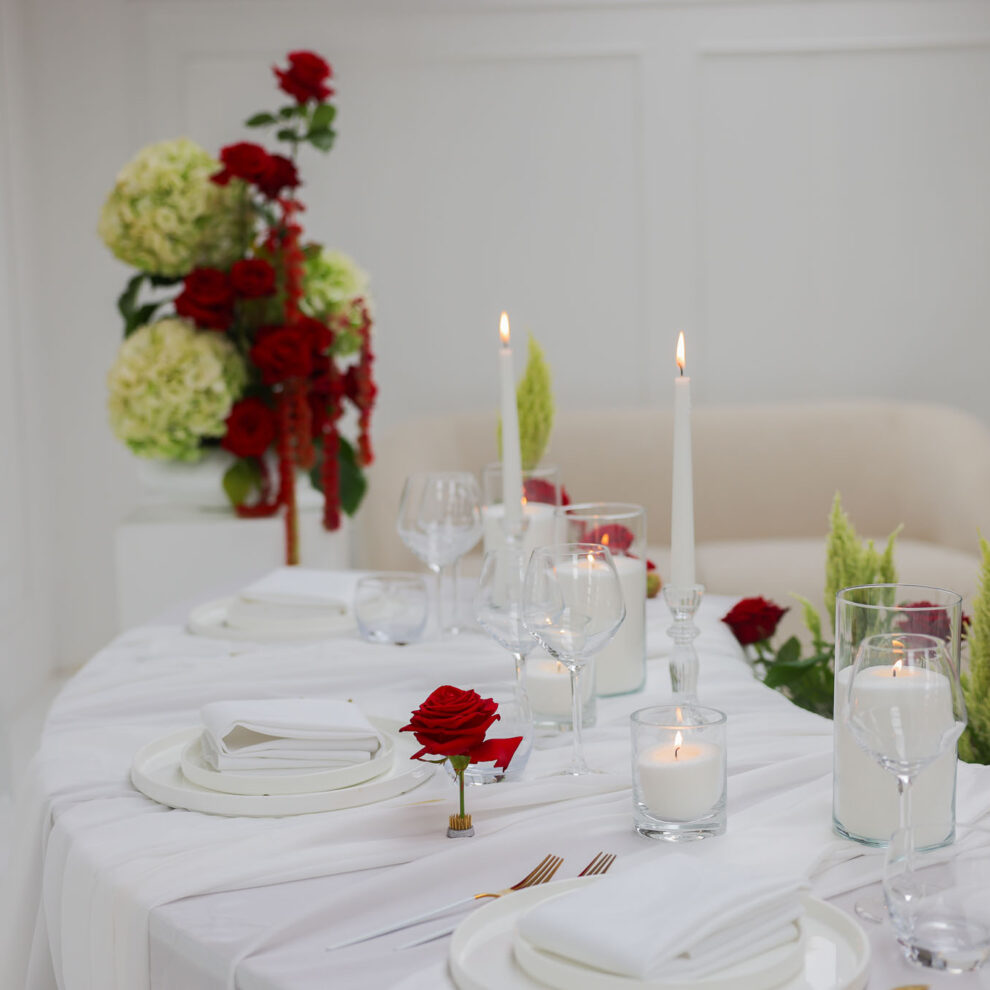 Ik koos voor een S-vormige tafelopstelling met een helder wit tafelkleed als basis en rode rozen als krachtige…