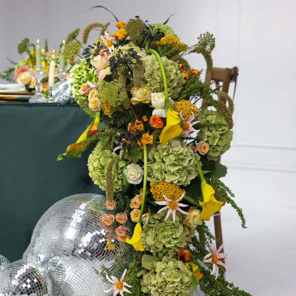 De “green + sparkle”-styling toont speelse accenten van citroengele calla’s en dahlia’s, afgewisseld met hangende amarant voor beweging.…